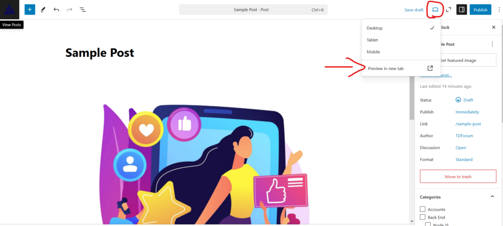 1. Click the “Preview” button at the top right to see how your post will look.
